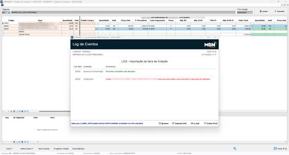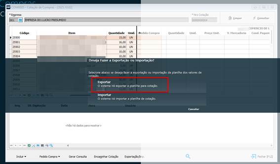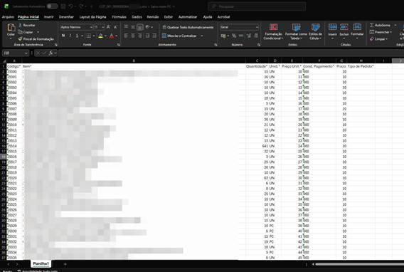 A planilha gerada terá os mesmos dados dos itens listados na tela cotação., porém se editada sua posição do item e retirado itens, serão levados para a importação somente os dados contidos nela.