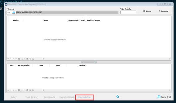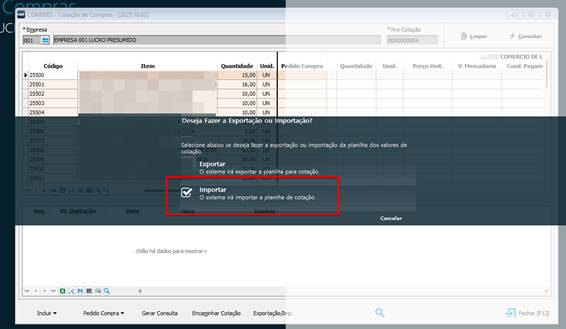 Para realizar a importação, após tratar as planilhas conforme as orientações acima, acesse novamente a rotina de cotação em Gestão de Compras” / “Tarefas” / “Cotação de Compras – COM0005”, consulte a cotação desejada e clique na opção “Exportação / Imp.” e selecione a opção IMPORTAR e será demonstrado opção para selecionar a planilha preenchida.