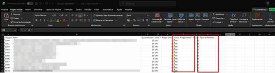 As colunas de “COND. PAGAMENTO” e “TIPO DE PEDIDO” deverão ser preenchidas com os dados correspondentes ao cadastro dos dados correspondentes no sistema para que sejam devidamente atribuídos a condição e natureza de operação do processo conforme a grade de naturezas de compras.